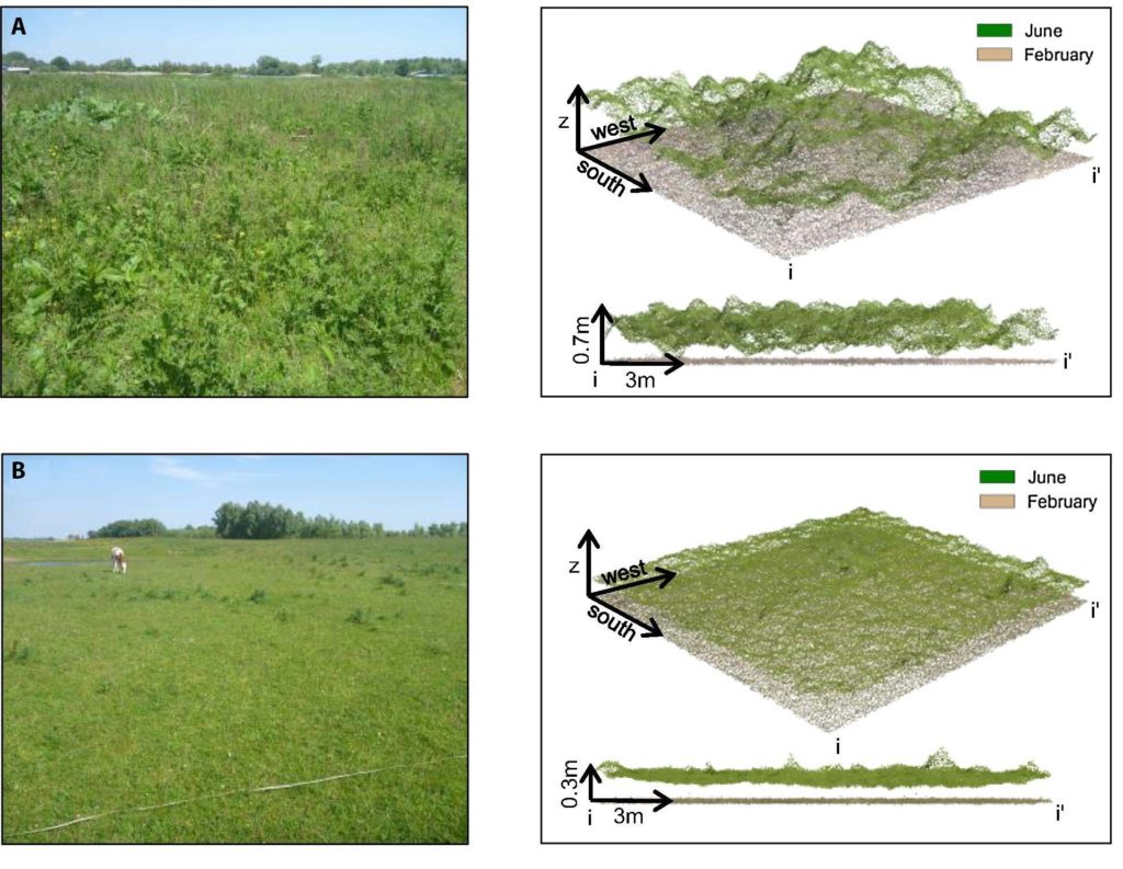 Field photographs of June and examples of true colour point clouds of a high herbaceous plot (A) and a natural grassland plot (B) of 15 × 15 m. (Source: Adapted from van Iersel et al. 2018)