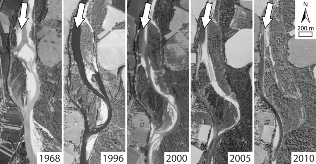 Morphological changes in a two channel system in the River Ain (France) near the village Mollon. (Source: IGN-France, Google Earth)
