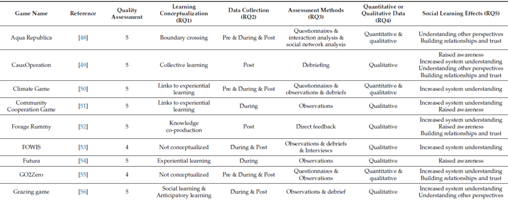 Serious games are increasingly applied in various disciplines and specifically to enhance social learning. However, there is no clear methodology on how to apply and evaluate serious games on social learning. The conducted literature review examined how three types of social learning – cognitive, normative and relational learning – have been evaluated in the application of serious games where players collaboratively address a sustainability problem.