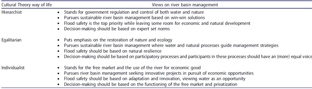 Lenses of cultural theory's three active rationalities in relation to Dutch river basin management (Source: Table 2; den Haan et al. 2018)