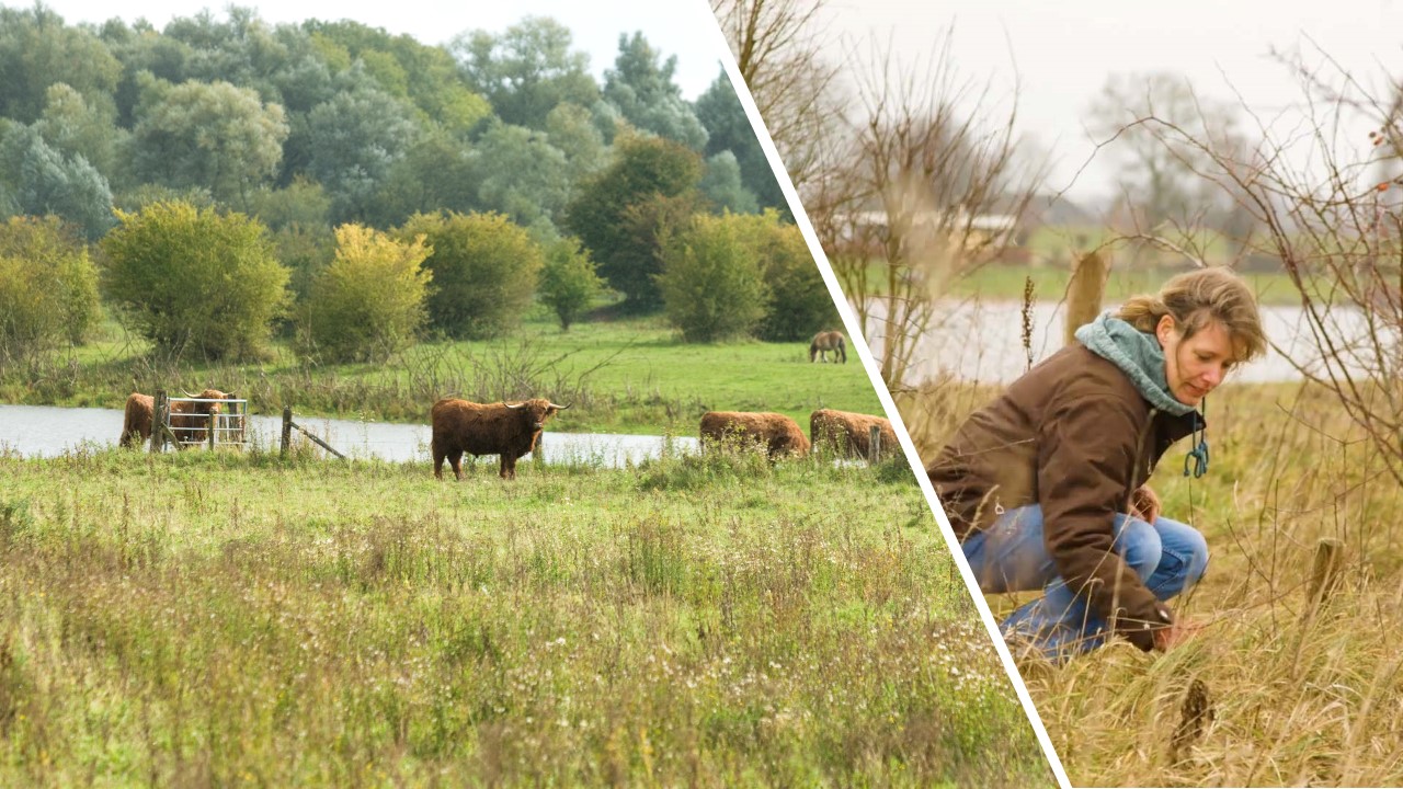 Snapshot of a Dutch floodplain that is managed with grazing and a typical field work to identify the corresponding vegetation patterns. (Source: Left: Rijkswaterstaat and Right: Bureau Beeldtaal Filmmakers. RiverCare video).