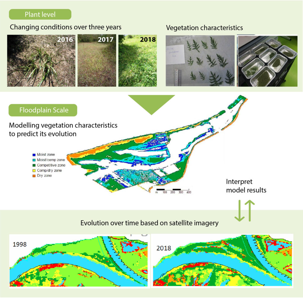 We combined fieldwork, modeling and satellite imagery to understand how vegetation evolves at a plant level and floodplains scale (see figure). On a plant scale, we collected in the field as input for a standard vegetation model the plant characteristics and changing conditions within a three-year period. For example, we looked at the soil composition and water availability whenever maintenance (excavation or grazing) and flooding or droughts occurred. We further upscaled the vegetation model to a floodplain area to determine its evolution over time. To get insights over the changes in the grass and herbaceous vegetation, we compared modeling results with satellite imagery that was openly available for a larger period of time.