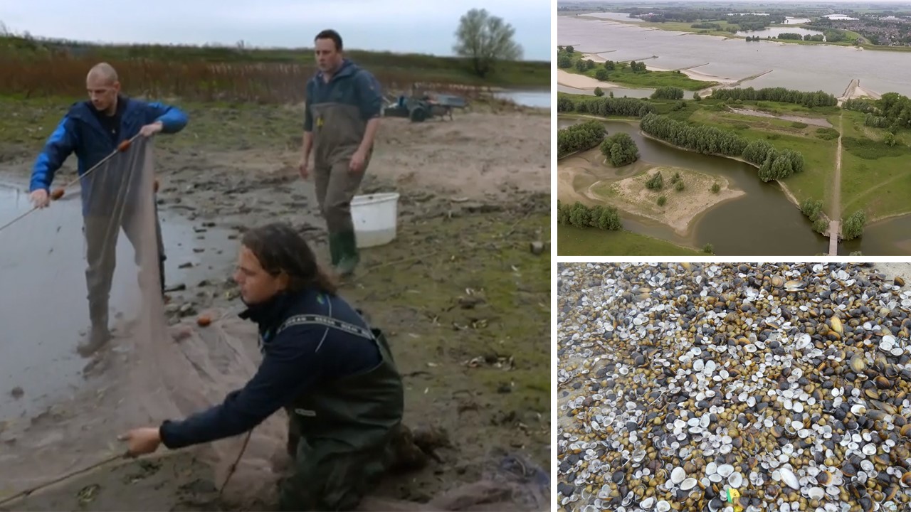 Snapshopts of the fish sampling activities, a side channel location along a Dutch floodplain and mass mortality of a mollusc community in a riverine habitat.