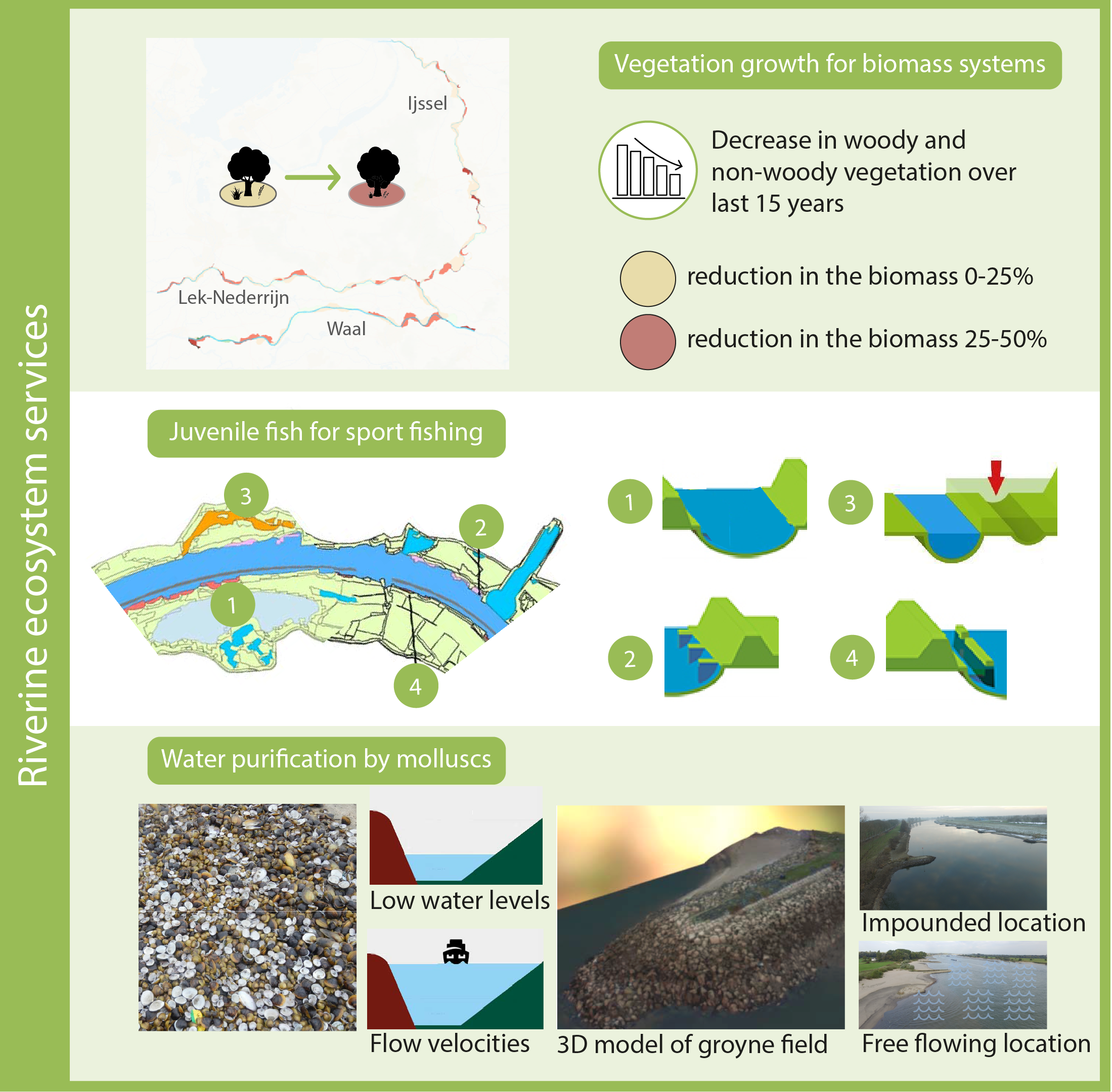River systems are amongst the more dynamic landscapes due to their natural dynamics but also due to the many river interventions and land use changes. Management strategies can be more sustainable when considering the multiple river functions. This is the case of recent interventions in the Dutch rivers such as the side channels that aimed at improving flood safety while increasing the riverine vegetation and habitats for aquatic species. However, the effects of these inteventions on space and time over the ecosystem services are hardly assessed due to limited tools or available methods. Hence, this project focused on developing approaches to quantify the spatiotemporal availability of 3 types of ecosystem services: riverine vegetation for biomass production, sport fishing and water purification by mussels.