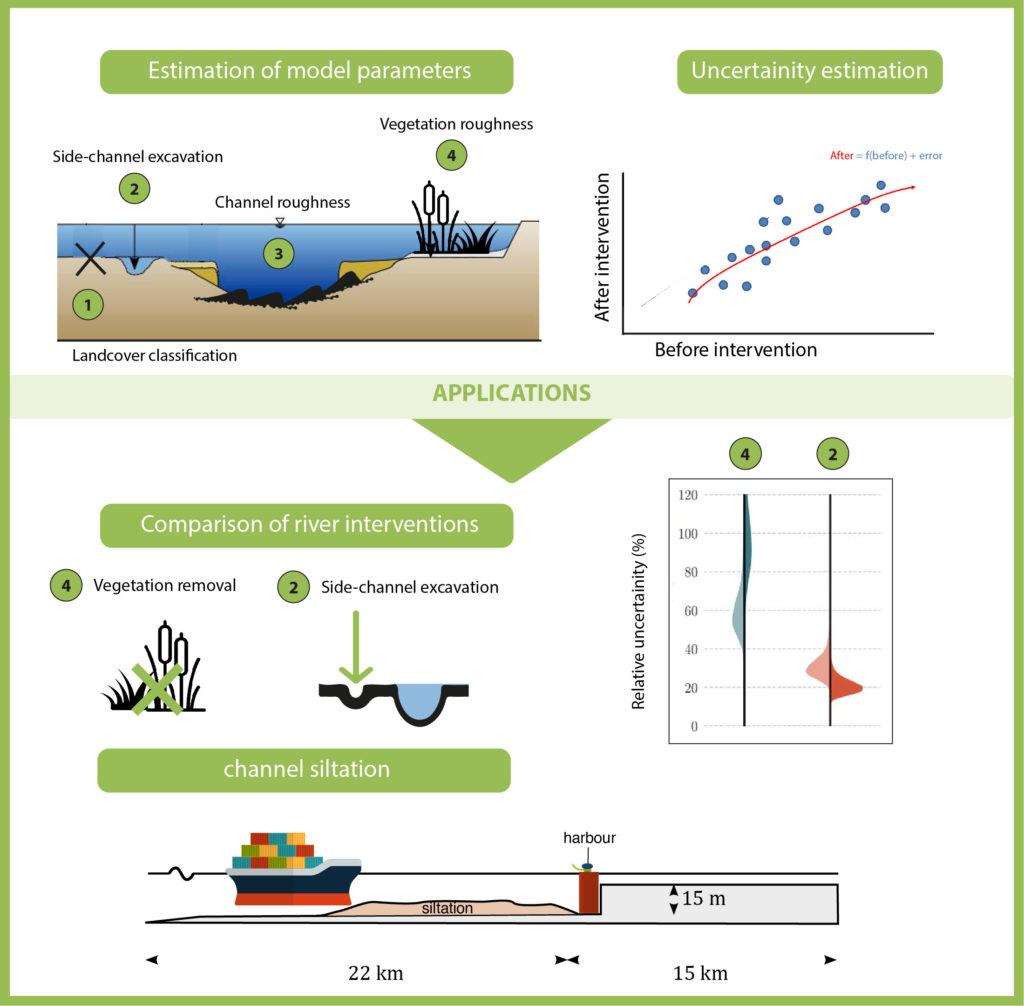 Rivers are continuously changing, both naturally and through interventions to for example mitigate flood or high water levels. Project advisors generally use numerical models to predict the maximum decrease in water levels due to river interventions such as side channels or floodplain vegetation changes. Water level predictions are generally affected by the limited understanding of the resistance for the water to flow in the river and its floodplain, which also affects the choices in model parameters. To deal with these unknowns, the variation or uncertainty of model results is often based on all possible combinations for the model parameters. However, this is computationally demanding and therefore not feasible for every-day practice. Depending on how much is the reduction in the water level at a critical location (see photo), a larger or smaller variation in model results becomes acceptable. Is model uncertainty so large that model results are not useful, or is it so small that it can be ignored? We reduce the computational time of estimating model uncertainty to get an indication of the variation in the predicted water levels.