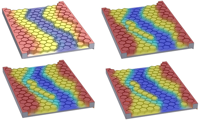 Impression of the Virtual River game interface – a physical 3D board where the output of the hydrodynamic model is projected back on the board – with some different arrangement of hexagon game pieces to for example construct a side channel, a longitudinal training dam and a dike relocation.