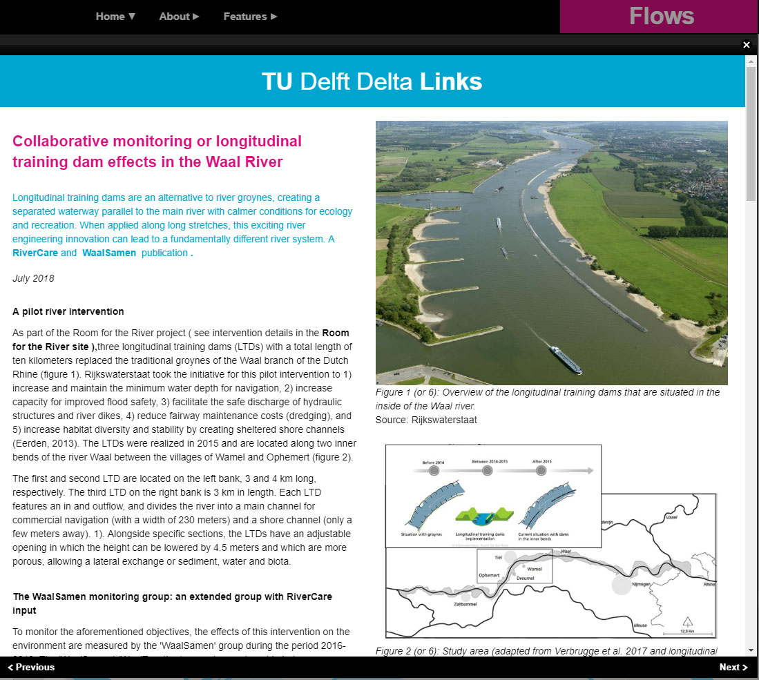 The Ministry of Water infrastructure (Rijkswaterstaat) started the longitudinal dams pilot as an innovative alternative to the typical river groynes in the Waal river. Along 10 kilometer stretch, the longitudinal dams create a side channel parallel to the main river to improve the hydraulic, ecological and recreational conditions for the river. Since 2014, the WaalSamen group measure and compare the effects before, during and after the construction of the longitudinal dam to adapt ther design and maintenance as necessary. The WaalSamen group includes representatives from Rijkswaterstaat, the inland shipping sector, national and regional angler associations and some of the Dutch Universities, research institutes and consultancies that are part of the RiverCare program.