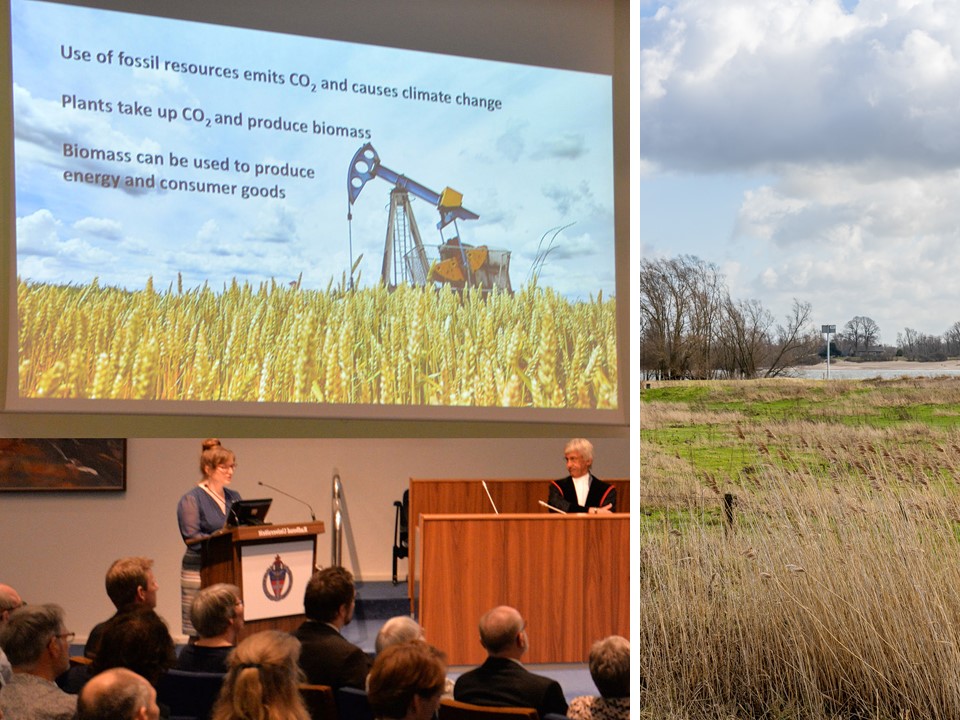 Left: Ph.D. thesis ceremony on April 18, 2019, at Radboud Nijmegen University. Right: Snapshot of riverine biomass for more sustainable use.